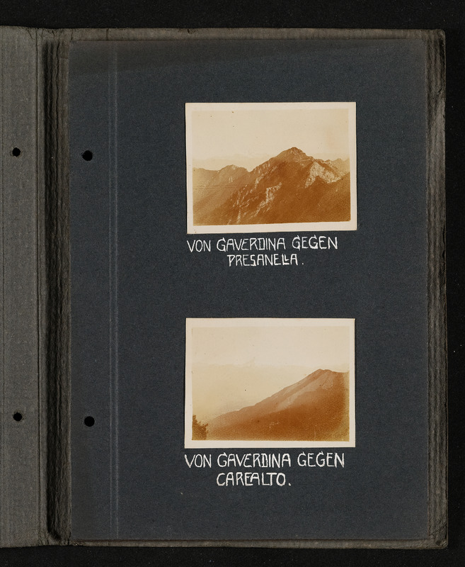 Fotoalbum FRONT 1918 von Ludwig Pullirsch, Blatt 12. Foto oben: von Gaverdina gegen Presanella, Foto unten: von Gaverdina gegen Carè Alto