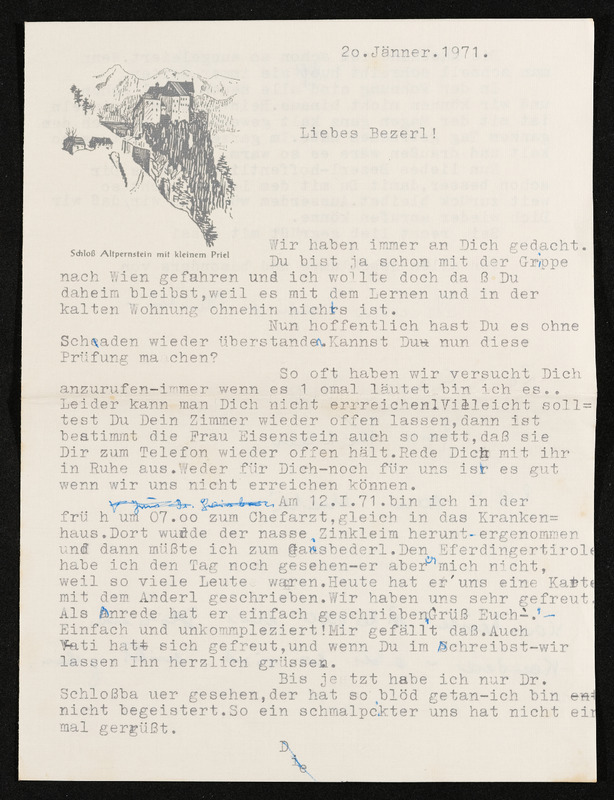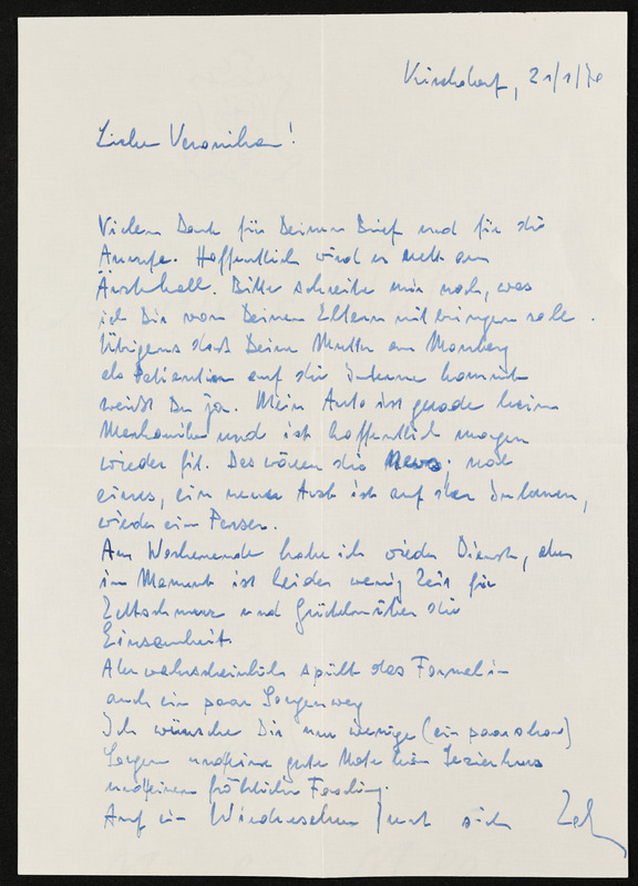 Brief an Veronika Erntl, datiert mit 21. Jänner 1970, Datum des Poststempels am Kuvert vom 22. Jänner 1971