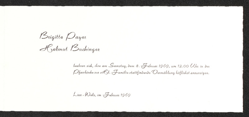 Einladung an Veronika Erntl von Brigitte Payer und Helmut Buchinger, Bekanntgabe (Einladung zur) Vermählung am 8. Februar 1969