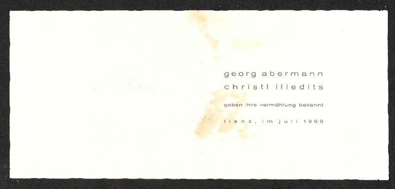 Einladung beziehungsweise Nachricht an Veronika Erntl von Christl Illedits und Georg Abermann, Bekanntgabe ihrer Vermählung im Juli 1969