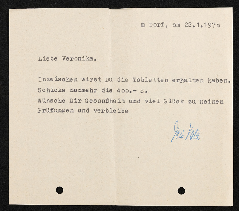 Nachricht vom Vater an Veronika Erntl, 22. Jänner 1970
