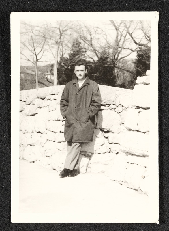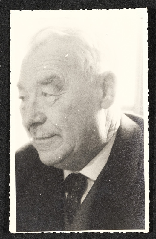 Fotografie eines Mannes im Mantel, der an einer Steinmauer lehnt. Rückseite bechriftet, Handschrift nicht lesbar. Stempel zum Teil lesbar mit der Aufschrift Hotel Praha
