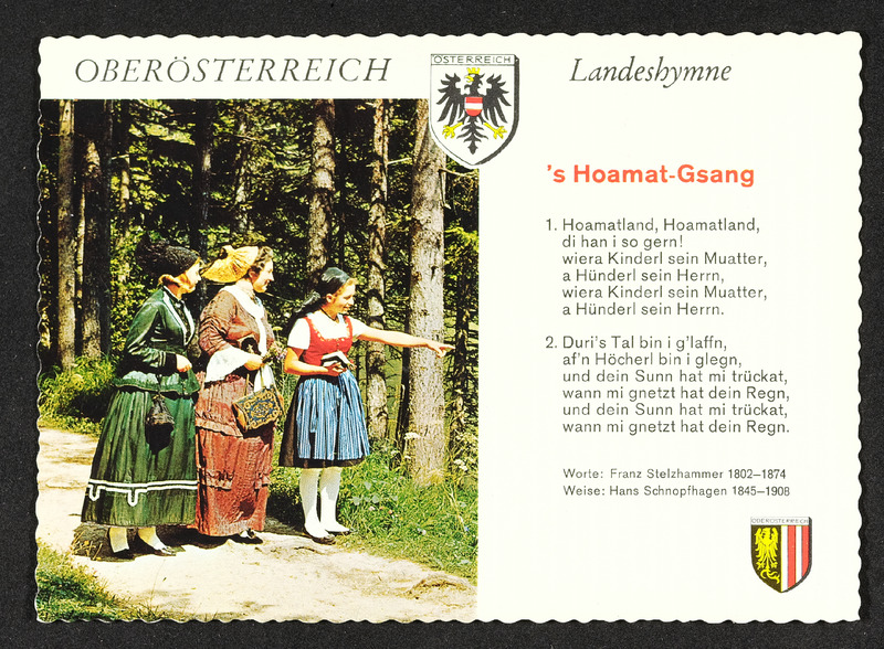 Ansichtskarte "Oberösterreich" aus dem Bestand von Veronika Erntl. Auf der Ansichtskarte ist links ein Foto von drei Frauen in verschiedenen oberösterreichischen Trachten vor einem Wald zu sehen, rechts ist der Text der oberösterreichischen Landeshymne zu lesen.