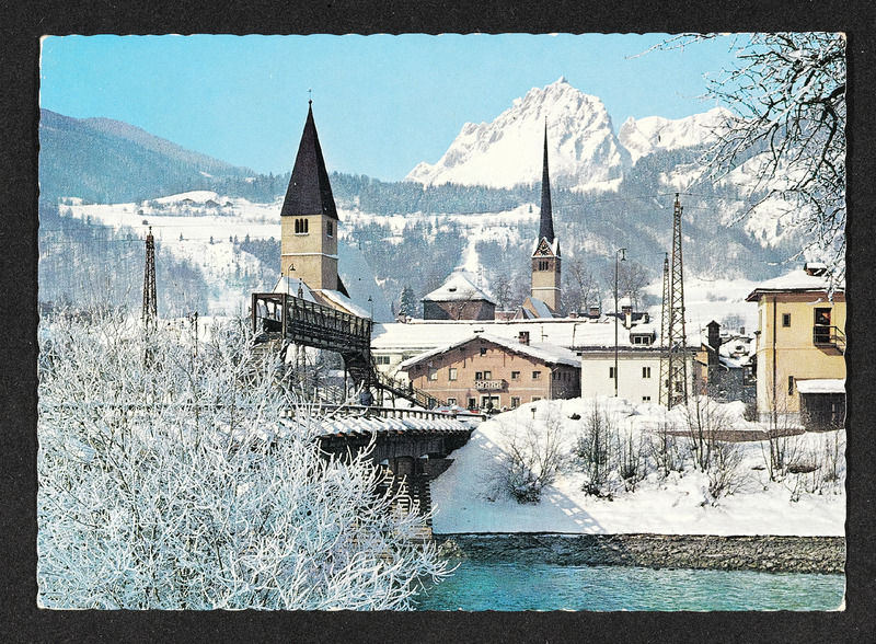 Ansichtskarte aus dem Bestand von Veronika Erntl mit dem Motiv Bischofshofen in Salzburg am Fuß des Hochkönigs. Im Vordergrund ist die Salzach und der Ortskern mit Kirchturm, dahinter ist der schneebedeckte Hochkönig zu erkennen.
