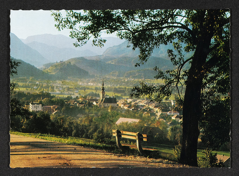 Ansichtskarte "Kirchdorf an der Krems" aus dem Bestand von Veronika Erntl. Im Vordergrund ist eine Bank an einem mit Bäumen umsäumten Weg mit dem Ausblick auf den Ortskern und den barocken Kirchturm des Ortes, im Hintergrund sind grüne, bewaldete Berge zu sehen.