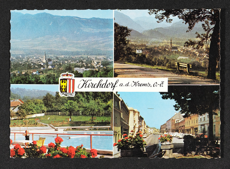 Ansichtskarte "Kirchdorf an der Krems" an Veronika Erntl mit vier Bildern: zwei Blicke über den Ortskern aus verschiedenen Perspektiven oberhalb des Ortes, ein Bild des Freibades und eine Ansicht des Ortszentrums. Persönliche Nachricht der Eltern an Veronika Erntl