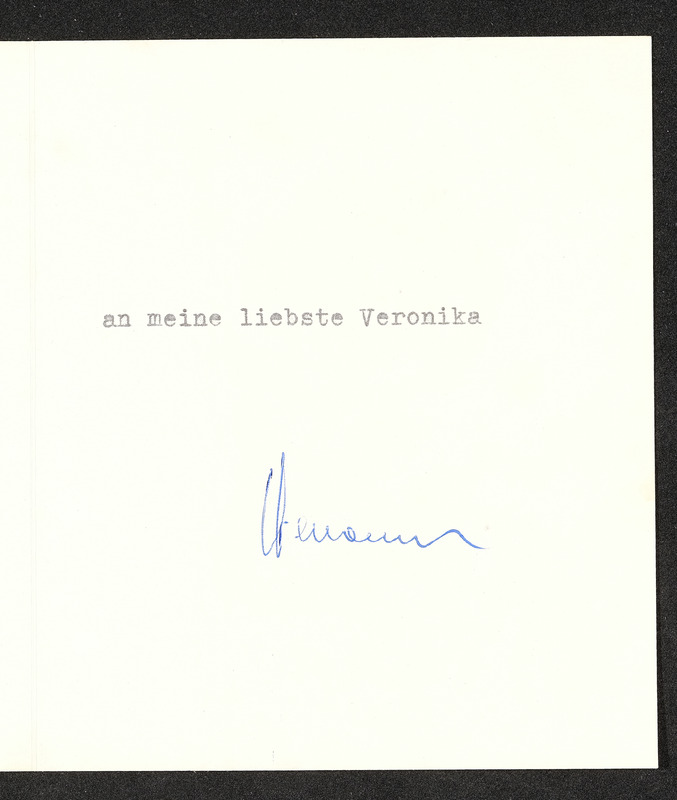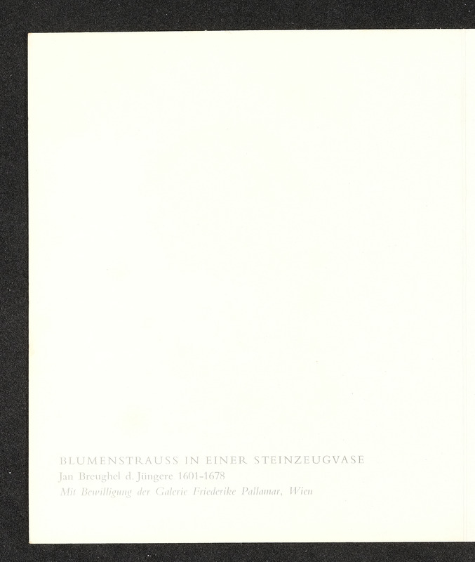 Karte an Veronika Erntl, Motiv Vorderseite ist ein Gemälde von Jan Breughel dem Jüngeren: "Blumenstrauss in einer Steinzeugvase". Künstler und Titel sind auf der linken Innenseite der Karte angegeben. Auf der rechten Innenseite steht eine persönliche Nachricht.