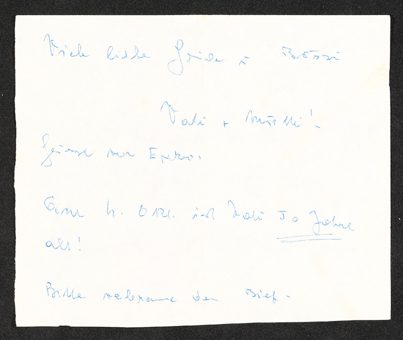Rückseite des Briefes an Veronika Erntl von ihren Eltern. Inhalt ist zum Teil persönlicher Natur, zum Teil berichten sie über einen Herrn und eine Frau Dr. Mayer und einen Bericht.