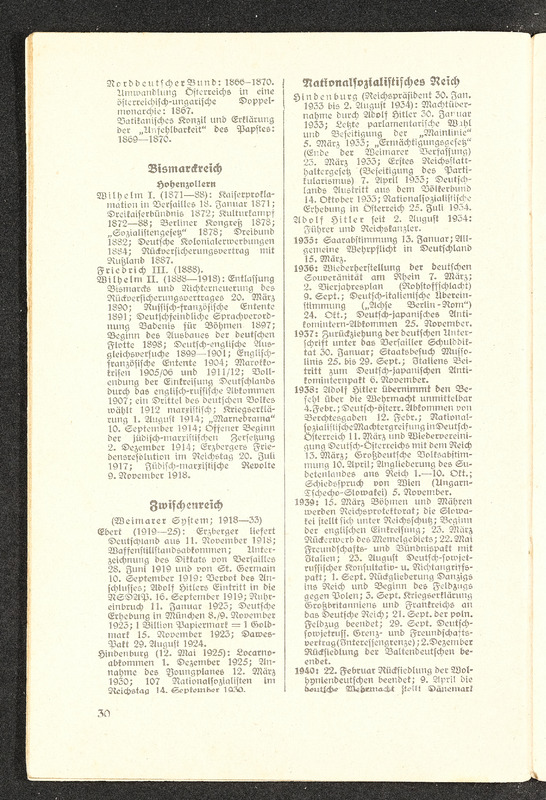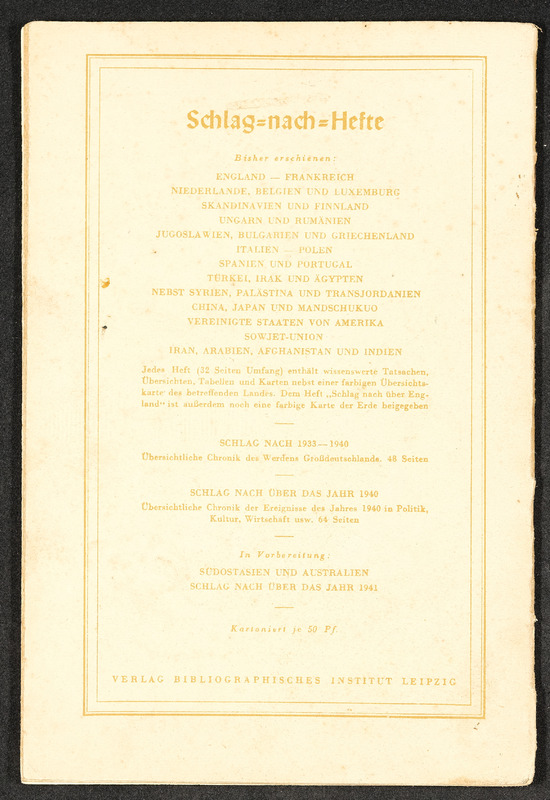 Informationsheft "Schlag nach über das Deutsche Reich"; Verlag Bibliographisches Institut Leipzig, 32 Seiten. Es beschreibt die nationalsozialistische Sicht auf das Deutsche Reich mit Propaganda und Ideologien in den Themen Geografie, Infrastruktur, Regierung, nationalsozialistische Gesetzgebung und Rassenideologie, Medien im Deutschen Reich und Geschichte.