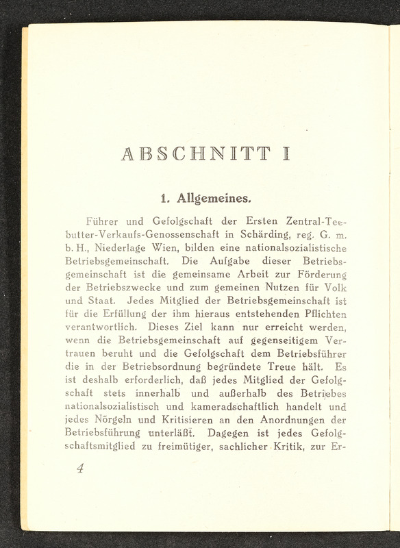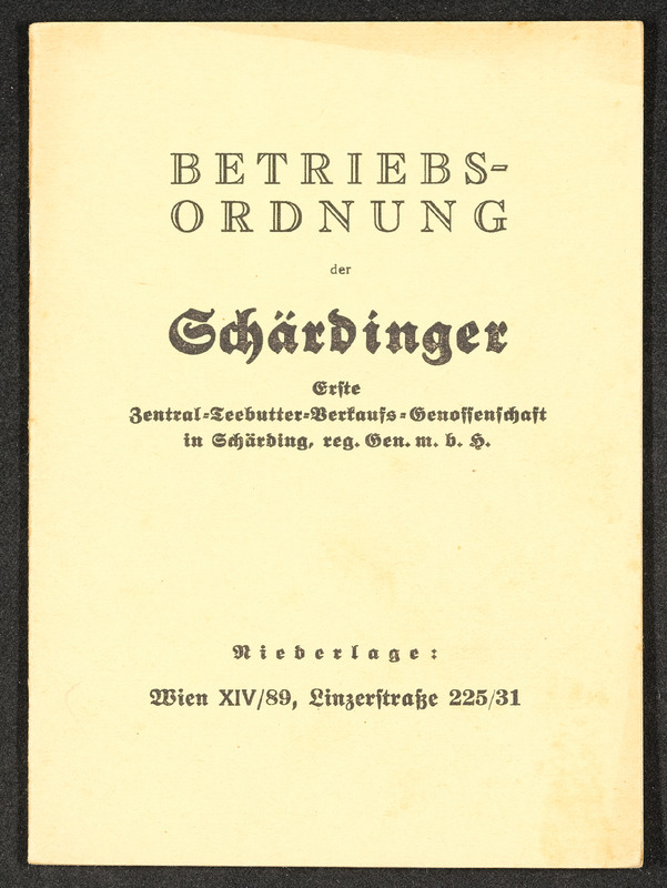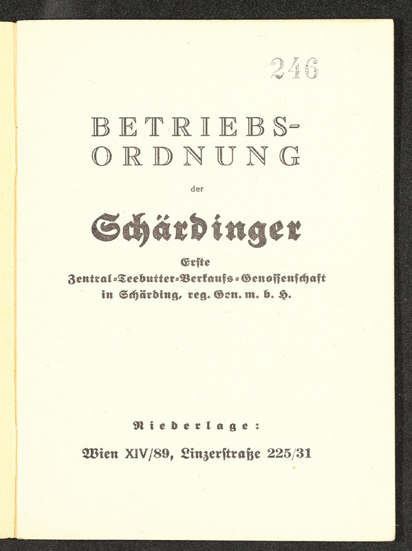 Heft Nr. 246 der Betriebsordnung der Schärdinger Erste Zentral-Teebutter-Verkaufs-Genossenschaft in Schärding, reg. Gen. m. b. H. Dürfte 1940 gedruckt worden sein, denn diese Jahreszahl steht handgeschrieben auf der Umschlagrückseite.