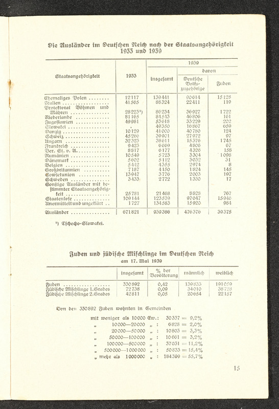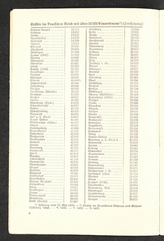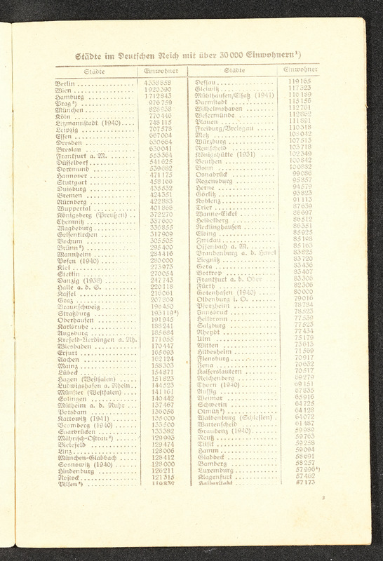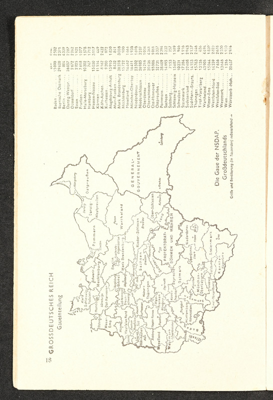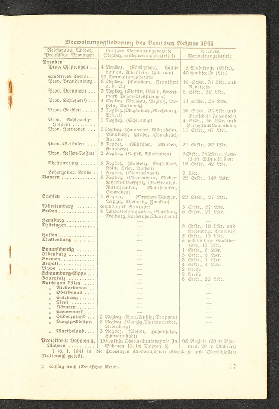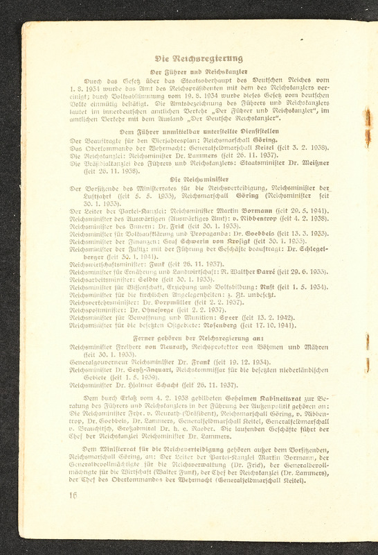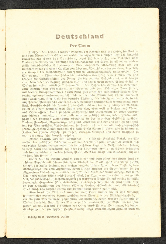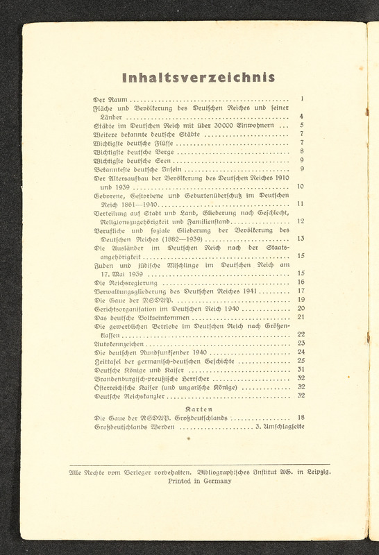 Informationsheft "Schlag nach über das Deutsche Reich"; Verlag Bibliographisches Institut Leipzig, 32 Seiten. Es beschreibt die nationalsozialistische Sicht auf das Deutsche Reich mit Propaganda und Ideologien in den Themen Geografie, Infrastruktur, Regierung, nationalsozialistische Gesetzgebung und Rassenideologie, Medien im Deutschen Reich und Geschichte.