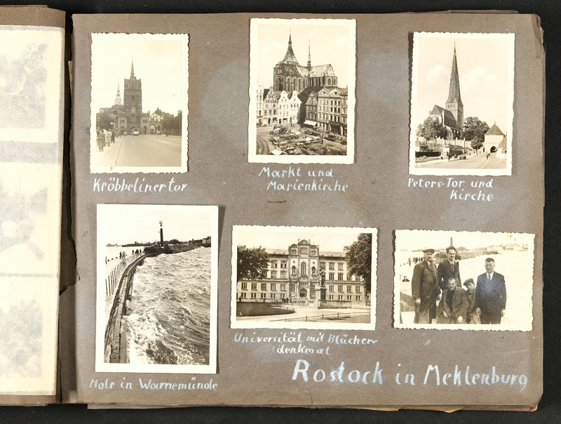 privates Fotoalbum mit Familienfotos, Freizeitfotos, Urlaubsfotos und Fotos aus dem Einsatz im 2. Weltkrieg, Fotos: "Rostock in Meklenburg: Kröbbelinertor, Markt und Marienkirche, Peters-Tor und Kirche, Universität mit Blücherdenkmal", "Mole in Warnemünde"