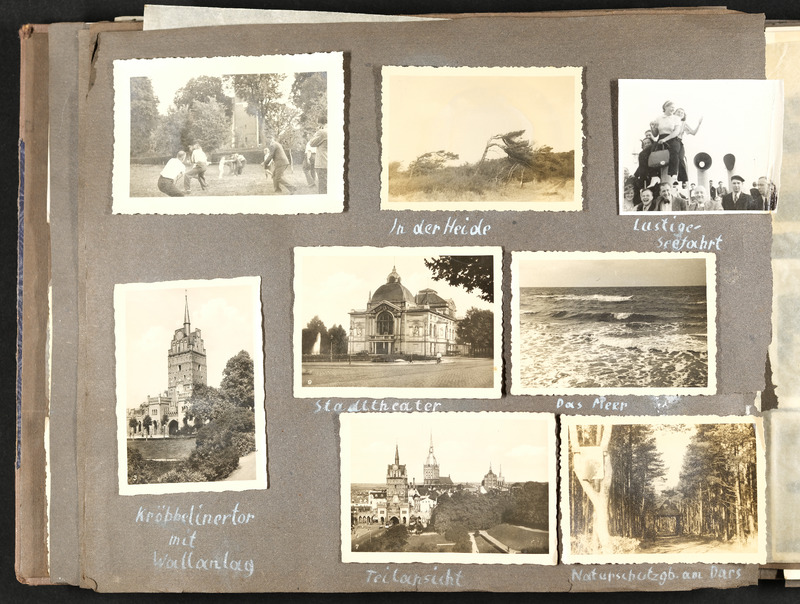 privates Fotoalbum mit Familienfotos, Freizeitfotos, Urlaubsfotos und Fotos aus dem Einsatz im 2. Weltkrieg, Fotos: "Rostock: Kröbbelinertor mit Wallanlage, Stadttheater, Teilansicht von Rostock", "In der Heide", "Lustige Seefahrt", "Naturschutzgebiet am Dars"