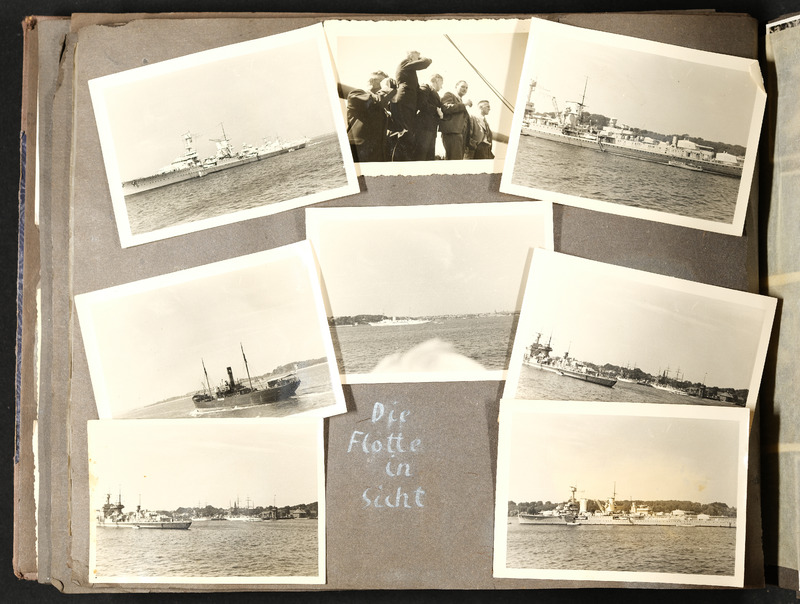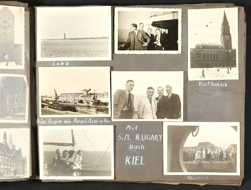 privates Fotoalbum mit Familienfotos, Freizeitfotos, Urlaubsfotos und Fotos aus dem Einsatz im 2. Weltkrieg, Fotos: "Mit S.M. RUGART nach Kiel", "Labö", "Prinz Eugen am Ausrüstungskai", Rathaus", "Abschied"