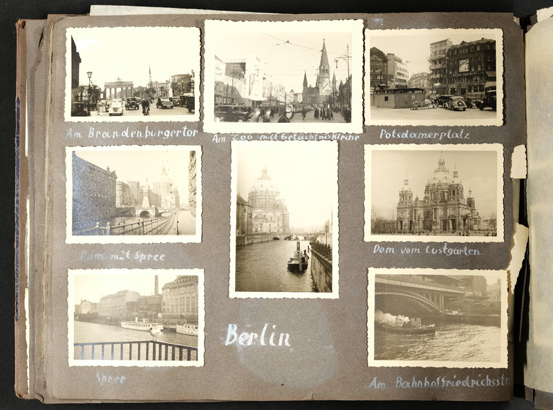 privates Fotoalbum mit Familienfotos, Freizeitfotos, Urlaubsfotos und Fotos aus dem Einsatz im 2. Weltkrieg, Fotos von Berlin: Am Brandenburgertor, Am Zoo mit Gedächtniskirche, Potsdamerplatz, Dom mit Spree, Dom vom Lustgarten, Spree, Am Bahnhof Friedrichsstr.