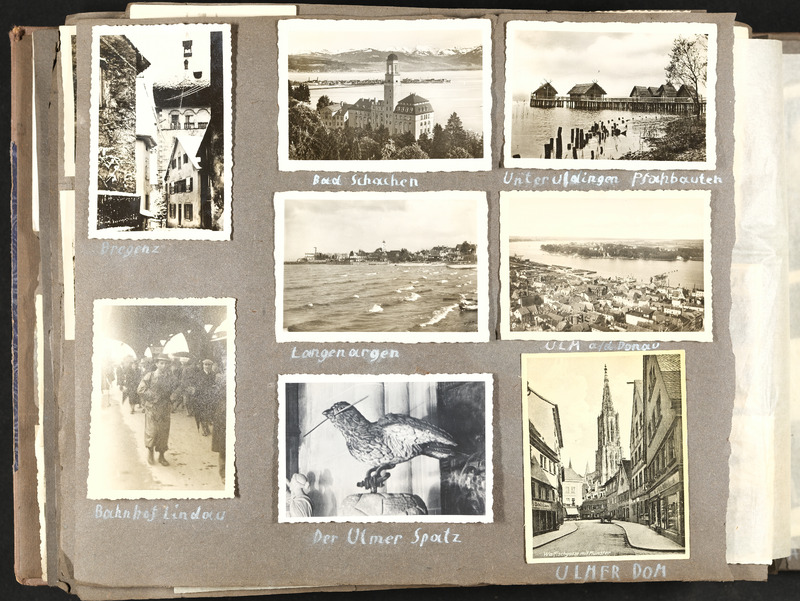 privates Fotoalbum mit Familienfotos, Freizeitfotos, Urlaubsfotos und Fotos aus dem Einsatz im 2. Weltkrieg, Fotos: "Bregenz", "Bad Schachen", "Unteruhldingen Pfahlbauten", "Bahnhof Lindau", "Langenargen", "Ulm an der Donau", "Der Ulmer Spatz", "Ulmer Dom"