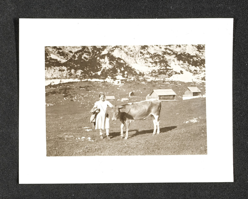 Wanderin auf der Alm mit Kuh