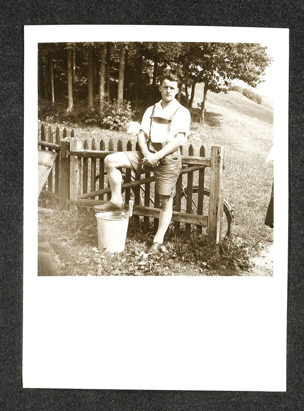 Mann an einem Gartenzaun mit Fahrrad