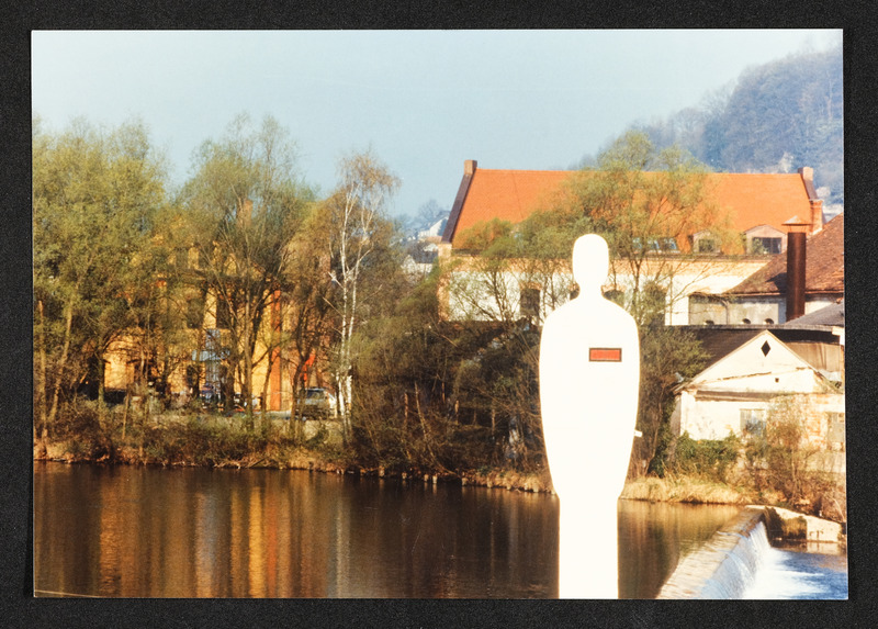 Museum Arbeitswelt - Statue in der Steyr - im Hintergrund Hack-Werke