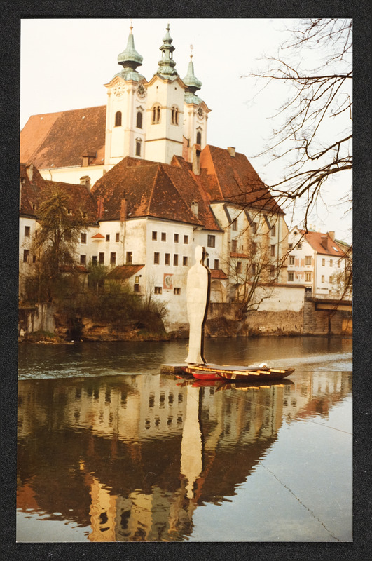 Statue auf der Steyr - im Hintergrund Michaelerkirche