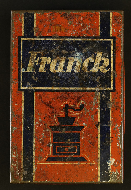 Blechdose Kaffeezusatz der Firma Heinrich Franck Söhne AG, Vorderansicht, Innenansicht, Seitenansicht, Rückansicht