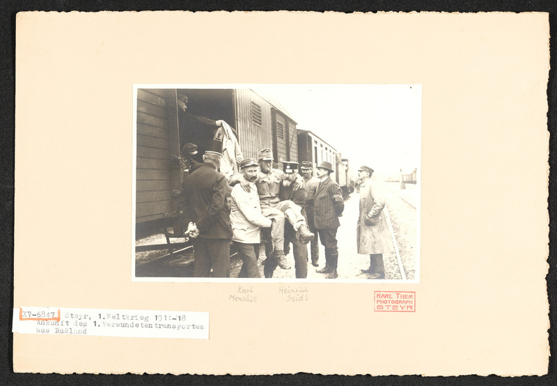Ankunft des ersten Verwundetetentransports von der russischen Front am Bahnhof Steyr
