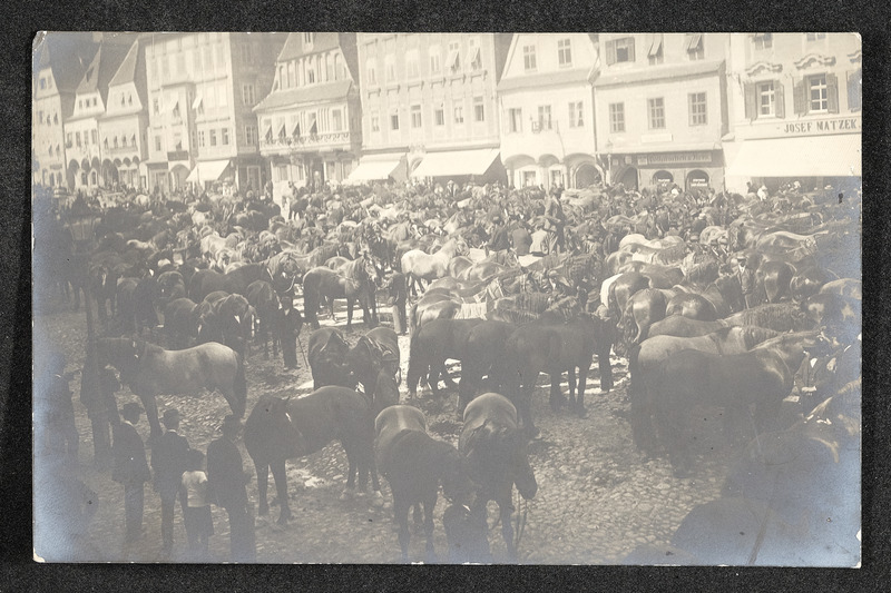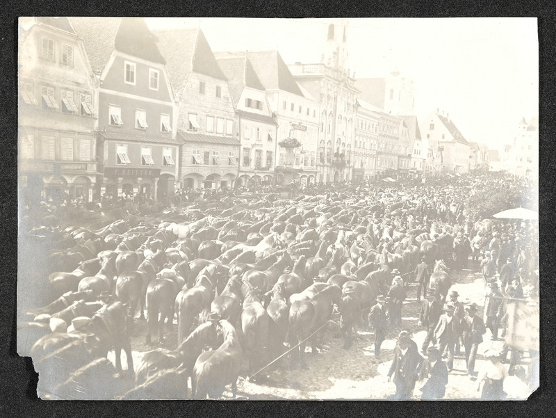 Pferde-Aushebung für Kriegszwecke im Zuge der Mobilmachung für den Ersten Weltkrieg am 31. Juli und 1. August 1914 auf dem Stadtplatz von Steyr
