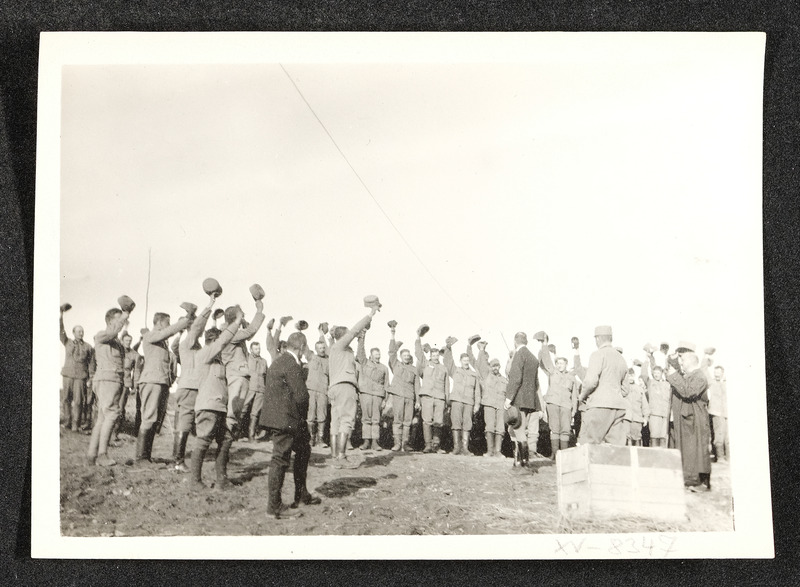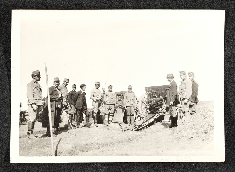 Frontbesuch des Steyrer Bürgermeisters Julius Gschaider an der russischen Front. Liebesgabenverteilung an die Soldaten der Batterie 1 des Feldkanonenregiments 42